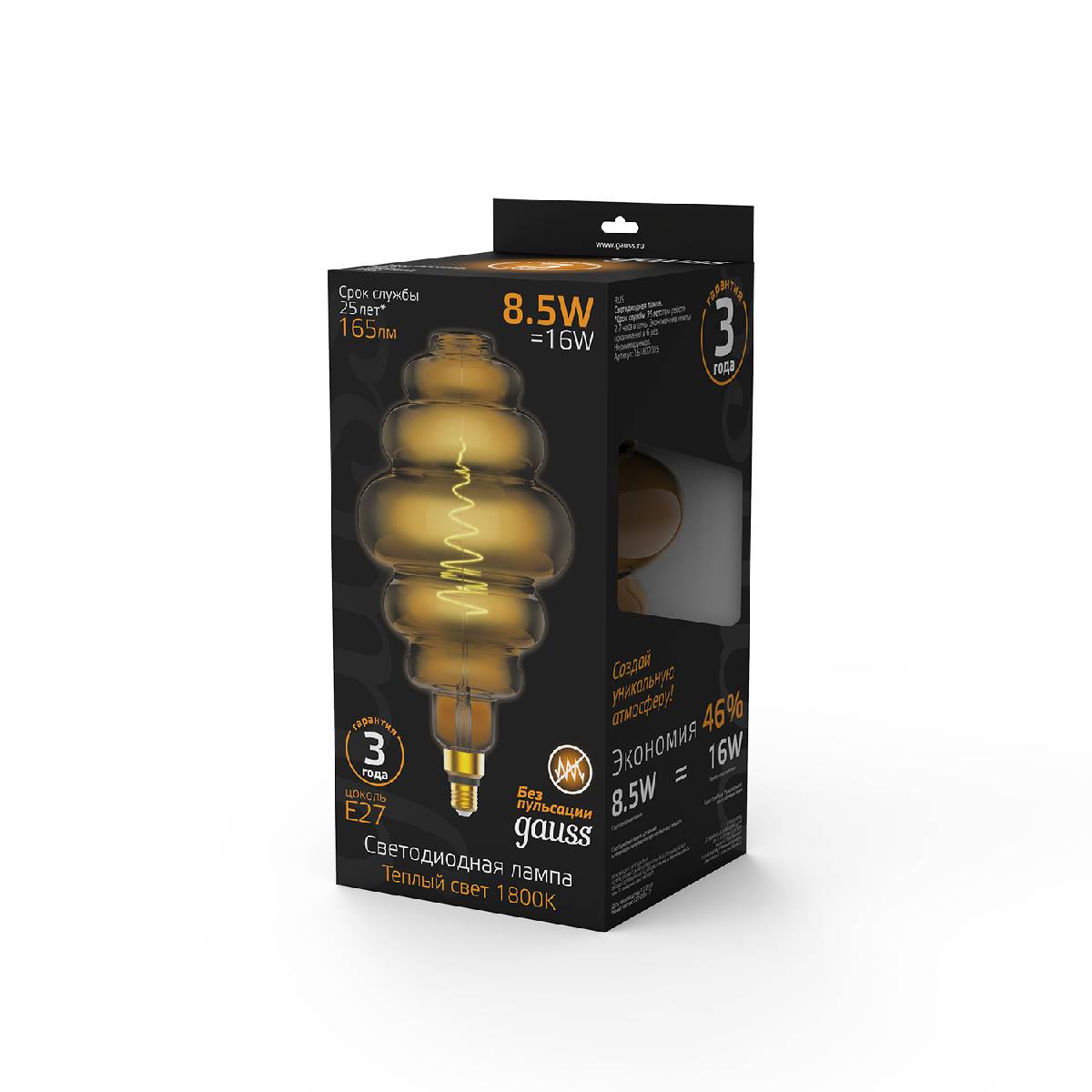 Лампа светодиодная филаментная Gauss E27 8,5W 2000K янтарная 161802105