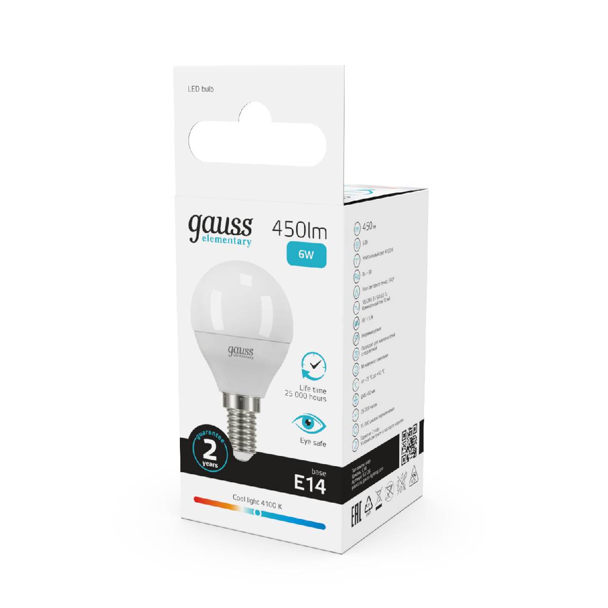 Лампа светодиодная Gauss E14 6W 4100K шар матовый 53126