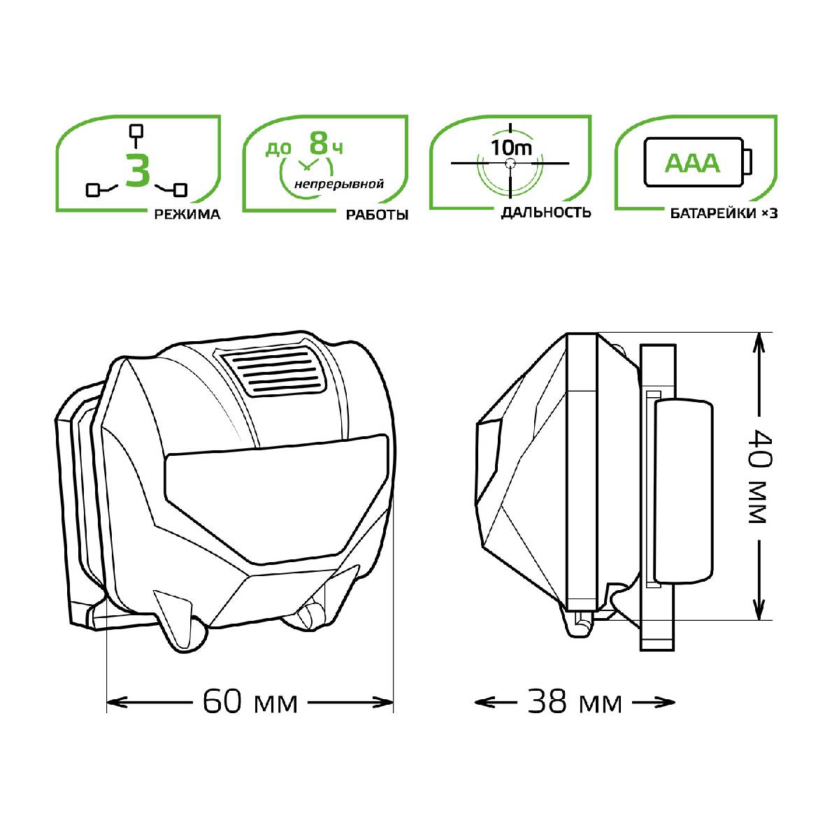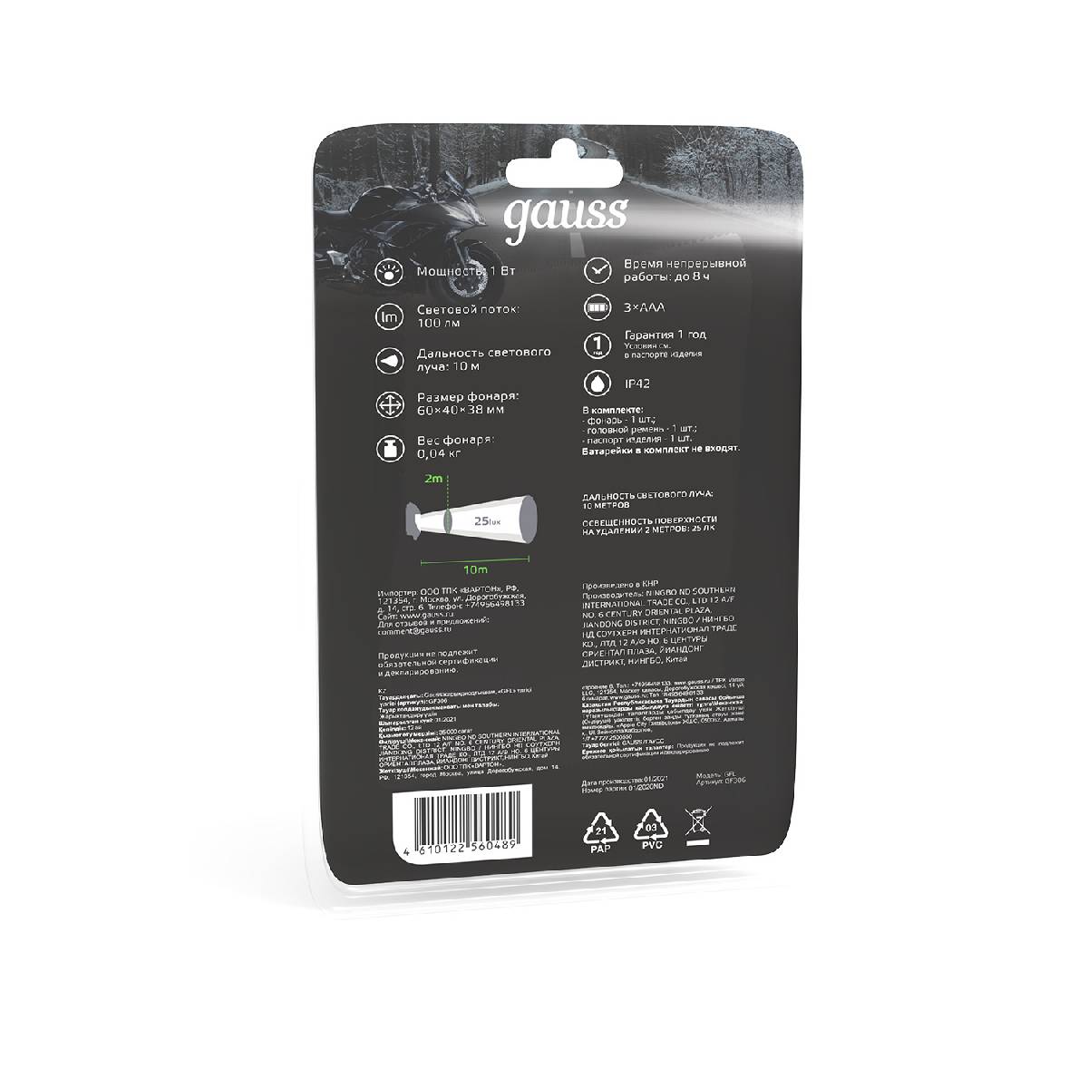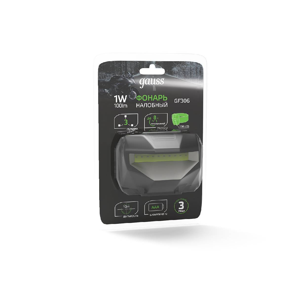 Налобный светодиодный фонарь Gauss от батареек 60х40 100 лм GF306
