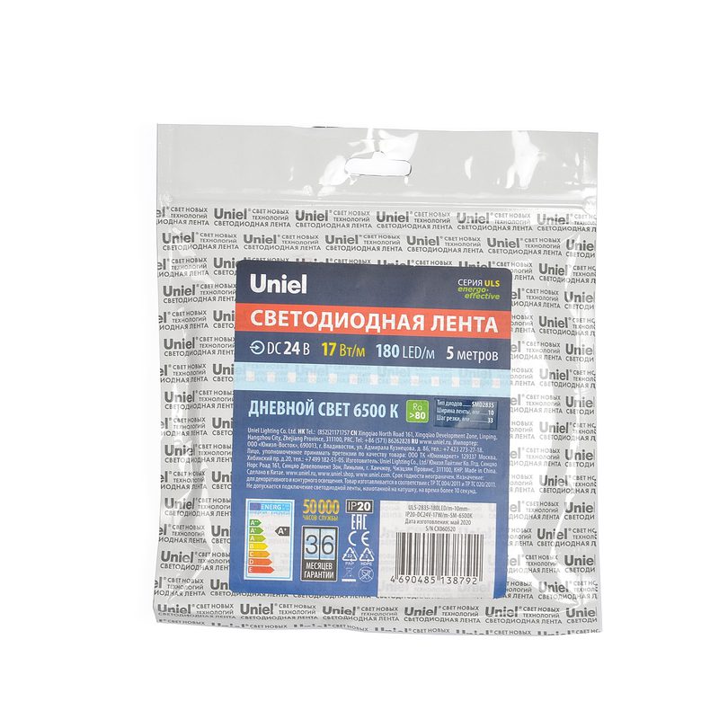 Светодиодная лента Uniel ULS-2835-180LED/m-10mm-IP20-DC24V-17W/m-5M-3000K катушка в герметичной упаковке